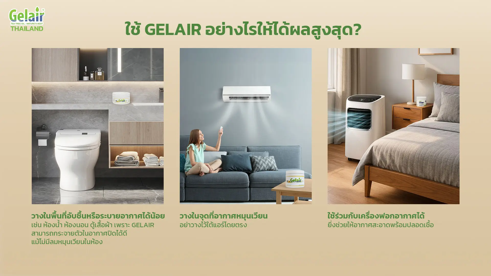 วางในพื้นที่อับชื้นหรือระบายอากาศได้น้อย เช่น ห้องน้ำ ห้องนอน ตู้เสื้อผ้า เพราะ Gelair สามารถกระจายตัวในอากาศ (Vapor Diffusion) ปิดได้ดีแม้ไม่มีลมหมุนเวียนในห้อง