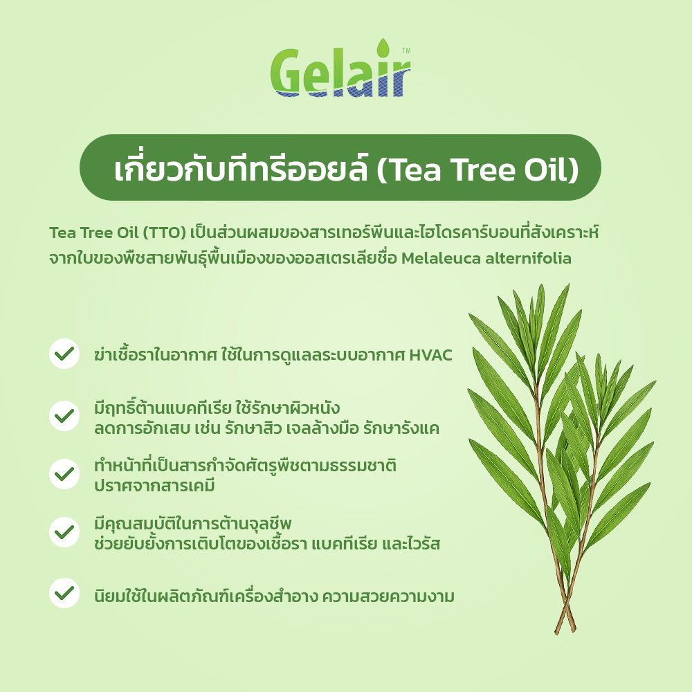 Gelair Air Treatment คือการนำทีทรีออยล์ที่ผ่านการวิจัยทางวิทยาศาสตร์มายืนยันประสิทธิภาพและความปลอดภัยสำหรับมนุษย์มาใช้เพื่อบำบัดอากาศ ผลการวิจัยและเอกสารประกอบสามารถศึกษาเพิ่มเติมเพื่อเป็นข้อมูลอ้างอิงให้กับลูกค้า